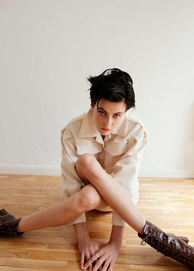 Jacket | Chaqueta Lera Mamba. Shorts | Braga Oysho. Boots | Botas BY FAR. Earrings and rings | Pendientes y anillos Apodemia